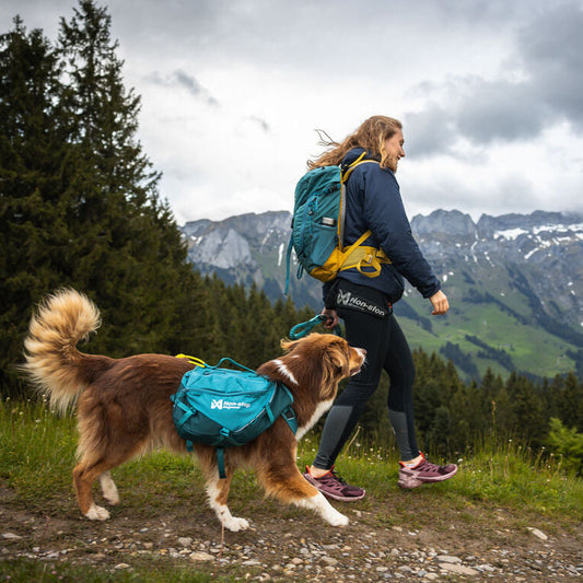 Im Rucksack des Hundes packst du zum Beispiel das Futter deines pelzigen Freundes, eine Erste-Hilfe-Tasche, einen Regenmantel oder eine Schlafunterlage. Der Hund sollte immer daran gewöhnt werden, den Rucksack zu tragen, bevor es auf die eigentliche Wanderung geht. Erhöhe das Gewicht allmählich und berücksichtige das Alter, die körperliche Verfassung und die sonstige Belastung deines Hundes während der Wanderung.