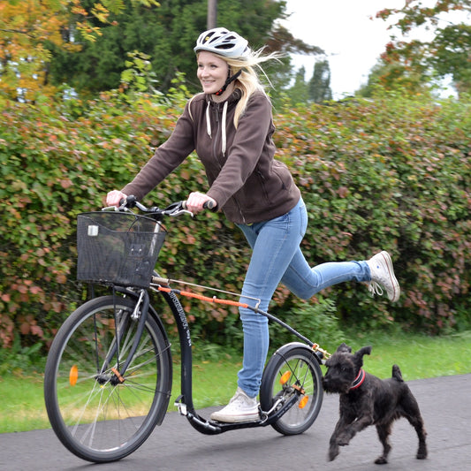 Mit dem Kickbike kann dem Hund eine zügige Bewegung geboten werden, auch wenn der Hund nicht frei laufen kann. Der Hund kann neben dem Kickbike traben oder, wenn er Zugtrieb hat, kann man ihn auch darauf trainieren, vorauszulaufen und das Kickbike zu ziehen. Dabei muss der Hund ein richtig großes Zuggeschirr tragen und am Rad eine flexible Zugleine sowie eine Bikeantenne haben, die verhindert, dass sich die Leine im Vorderrad verheddert. Mehr zu Ausrüstung findest du auf unserer Seite zum Hundefahrradsport.