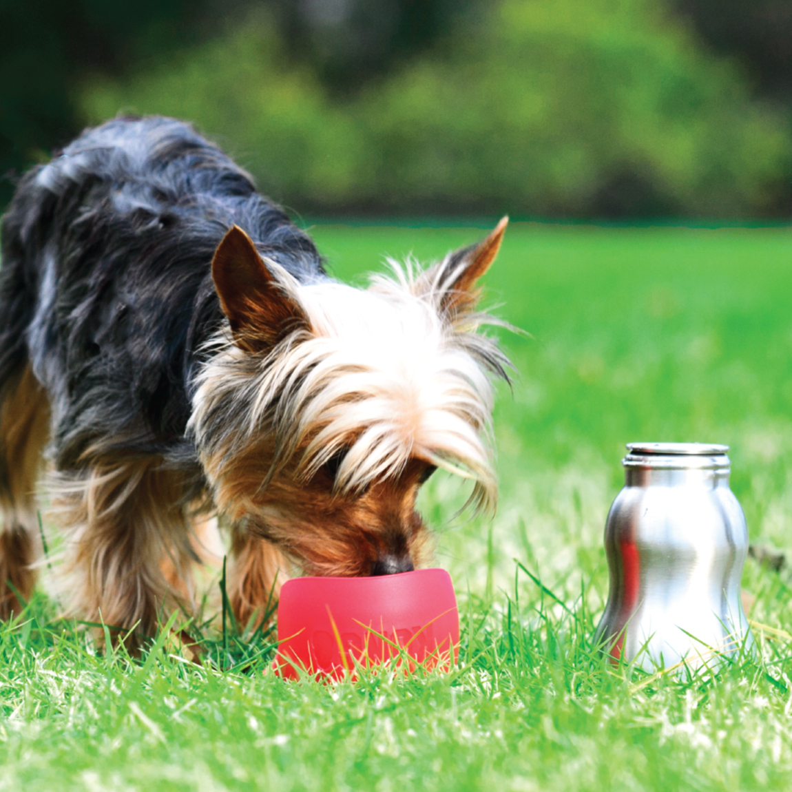 The Kong H20 bottle cap doubles as a water bowl, and its design allows the dog to drink easily and naturally. The bottle has a wide mouth so water left in the bowl can be conveniently poured back into the bottle.