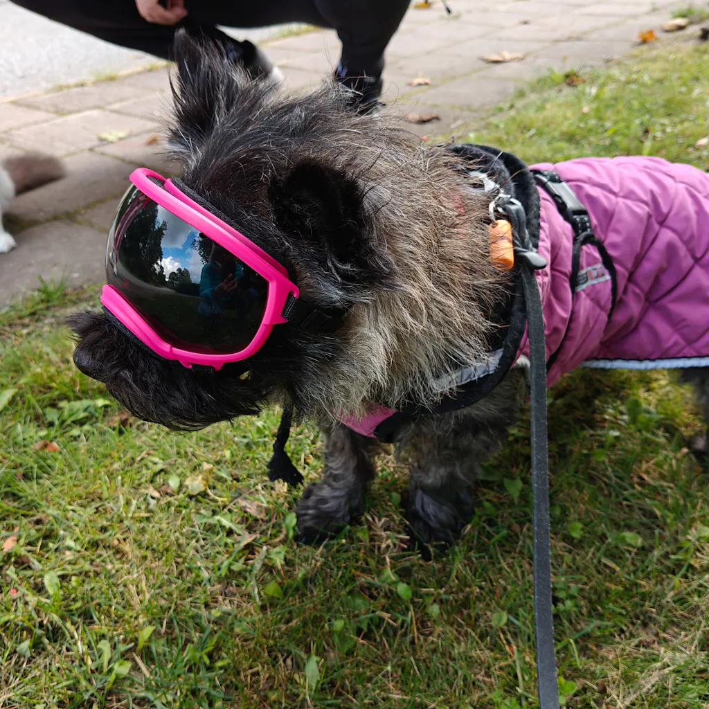 Cairnterrieri tyttö Kerttu kärsii kovasti silmiin osuvista auringon säteistä, taustalla silmäsairaus. Ostimme lasit silmien suojaksi. Alkuun (pari päivää) oli Kertulla hankala olla lasien kanssa ja otti ne kätevästi itse pois. Yllättäen kuitenkin on sen verran tottunut muutaman harjoittelukerran jälkeen, että on jo päästy ulkoilemaan lasit silmillä. Nyt ei häikäise ja Kerttu pystyy tassuttelemaan ilman aiemmin esiintyneitä horjahteluja ja taaksepäin säikähtäneenä vetaytymisinä. Lasit olivat heti sopivan kokoiset, istuvat hyvin päähän ja pysyvät paikoillaan. Jatketaan harjoituksia 🐕🐾
